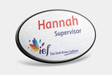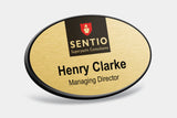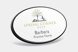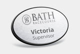 Oval Framed Name Badges are black plastic badges with a metal insert available in Silver, Gold and White as standard or we can print it any colour you like.