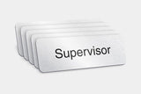 Pack of 5 pre-printed Supervisor Badges sold with a pin fitting. Ideal for any organisation these badges are a great low cost option. Made from aluminium and available in Gold, Silver or White. Individual badge size 70 x 20mm.