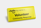 Community Response Volunteer NHS Name Badge with a yellow background and printed with the official #hello my name is... logo. This badge comes with a pin fitting as standard.