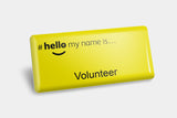Volunteer NHS Name Badge with a yellow background and printed with the official #hello my name is... logo and the job title 'Volunteer'. Space has been left for you to add and replace names quickly using a label printer and tape available to buy here or from any good stationer. This badge is supplied with a pin fitting as standard.